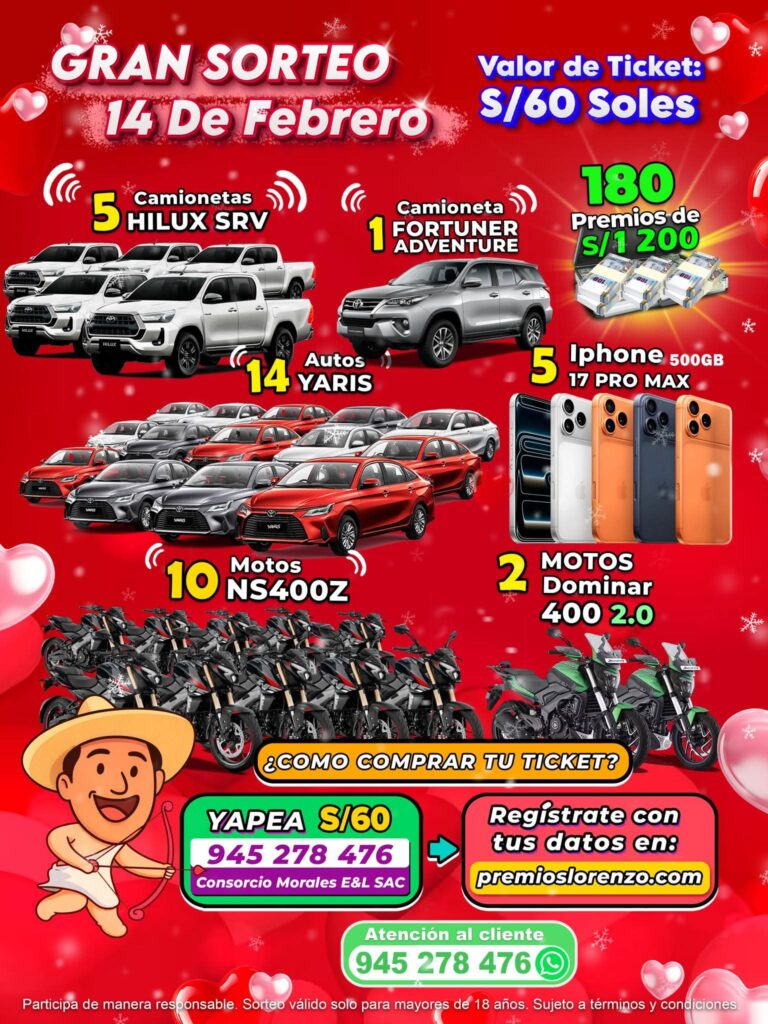 Con un ticket de tan solo S/60 soles, los participantes tienen la oportunidad de ganar desde modernas camionetas hasta los más avanzados dispositivos tecnológicos, pasando por motos de alta cilindrada y los tradicionales fajos de dinero que han convertido a la rifa Rico Piura en sinónimo de transformación social. La emoción está garantizada para este 14 de febrero.